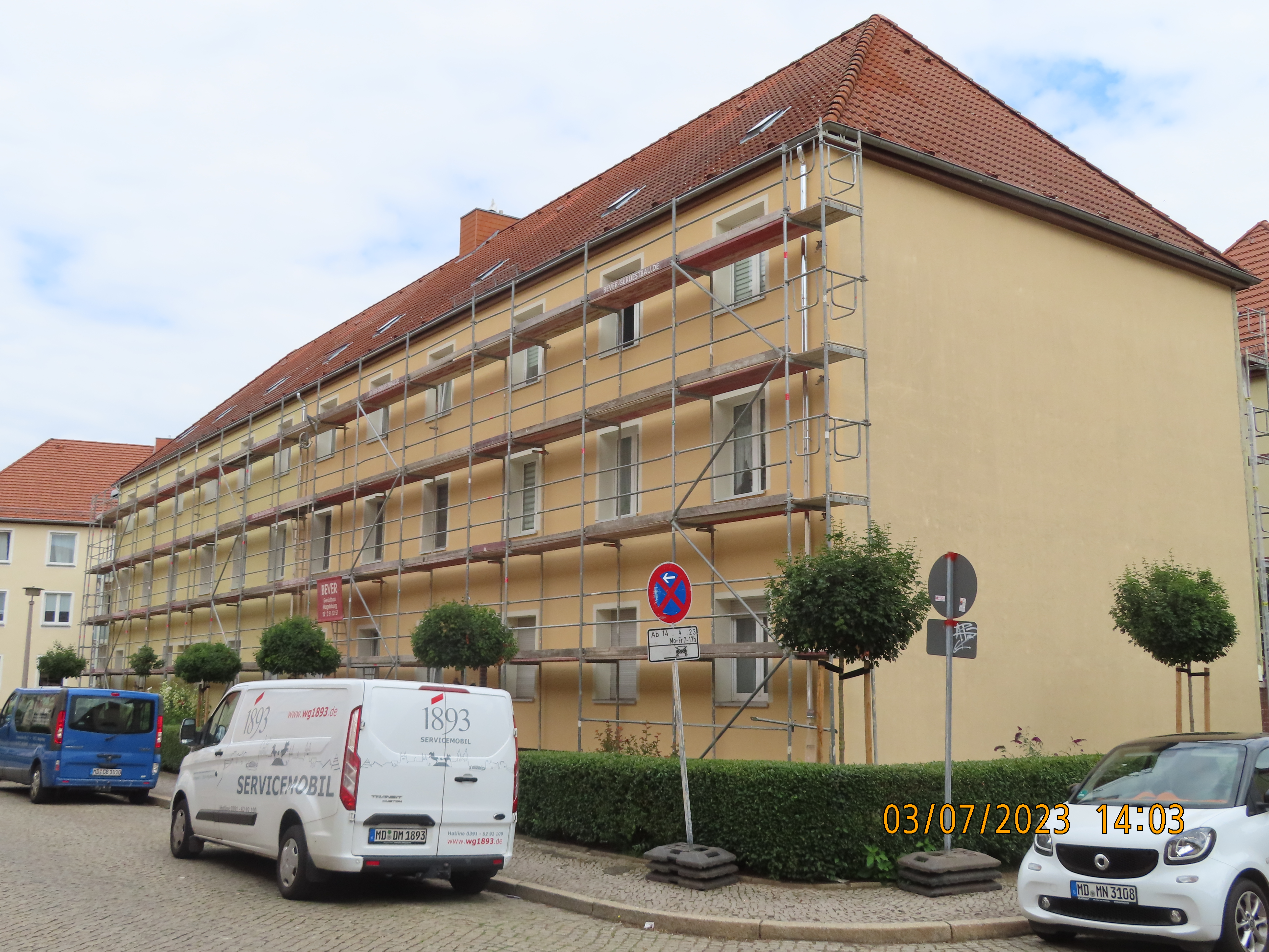 Die Arbeiten an den Fassaden haben hier bereits im April im Bereich Helmholtzstraße 1 bis 13 und Erich-Weinert-Straße 4 begonnen. Inzwischen sind die Dämmarbeiten auch im Niemöller-Privatweg und der Rudolf-Wolf-Straße in vollem Gange. Im Quartier sollen dieses Jahr insgesamt rund 17.000 m² Wärmedämmverbundsystem in 13 Objekten verarbeitet werden. Hierfür wurde uns der Abruf von Fördermitteln in Aussicht gestellt.