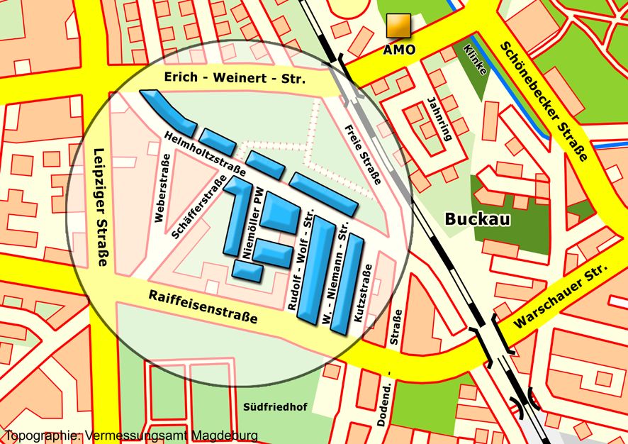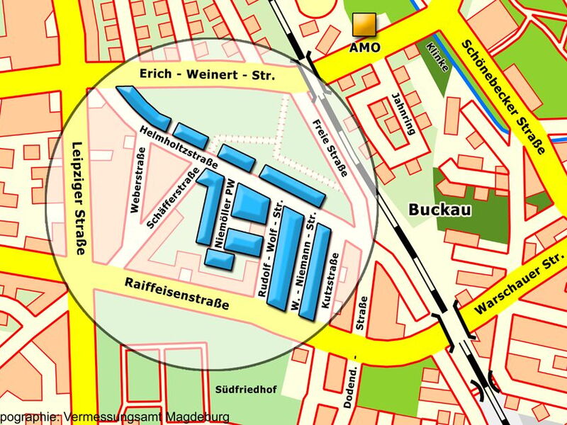 Vis-à-vis mit Puppentheater, der Elbe und dem Klosterbergegarten bietet der Wohnungsbestand der 1893 in Buckau alles was das Herz begehrt. Zentrumsnah und dennoch im Grünen gelegen gibt es hier viel Kultur von Kleinkünstlern aber auch das Gesellschaftshaus und die Gruson-Gewächshäusern zu entdecken.