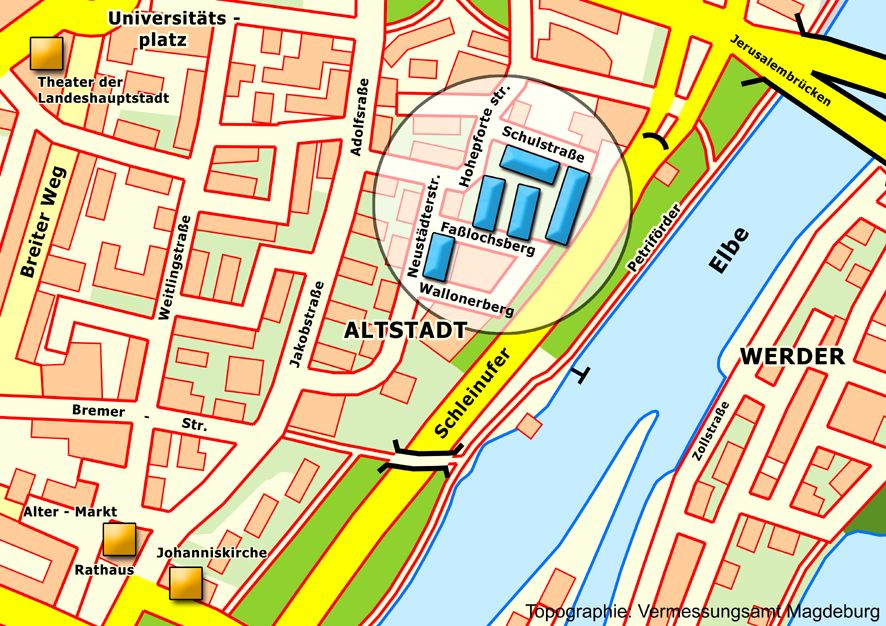 Dazwischen liegen Alter Markt - das Herz von Magdeburg - und der Breite Weg, die traditionell wichtigste Einkaufsstraße der Stadt.