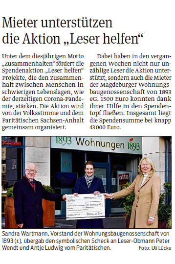 Über die zahlreiche Beteiligung an der Spendenaktion Volksstimme „Leser helfen“ unter dem Motto „Zusammenhalten“ haben wir uns sehr gefreut. Mit Ihrer Unterstützung ...