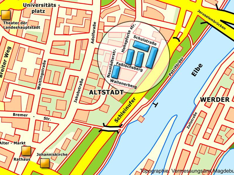 Dazwischen liegen Alter Markt - das Herz von Magdeburg - und der Breite Weg, die traditionell wichtigste Einkaufsstraße der Stadt.