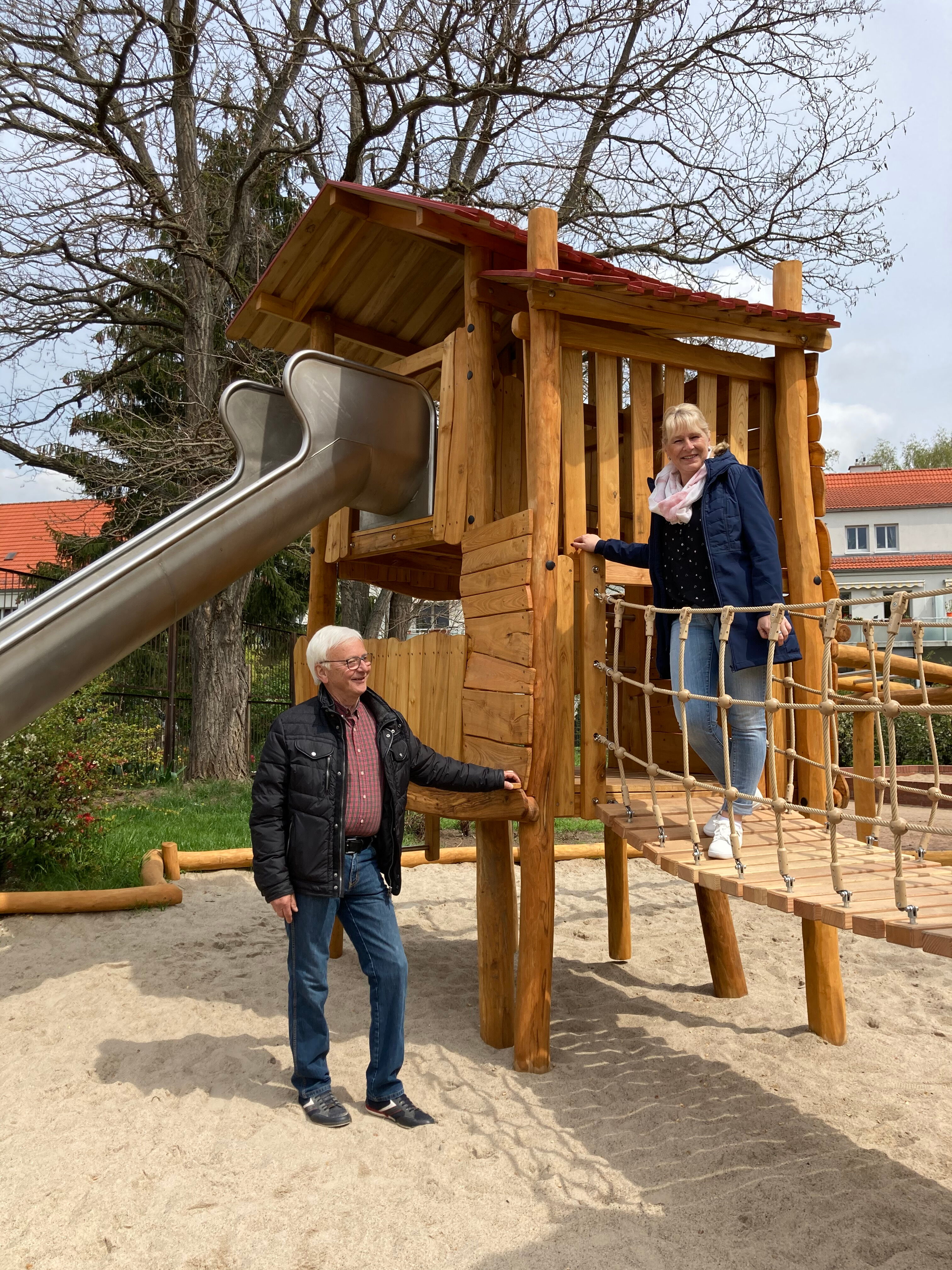Offizielle Eröffnung für das neue Spielplatz-Objekt war der 3. Mai 2021 –sie musste leider im kleinen Kreis erfolgen. Die Übergabe durch Magdeburgs Spielplatz-Profi, Albrecht Freise von der Firma Spielplatzservice Freise GbR fand gemeinsam mit der Kundenbetreuerin, Diana Schuldt statt und war dennoch feierlich.