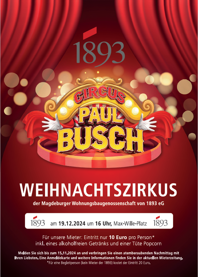Melden Sie sich an und bezahlen Sie bis zum 15. November 2024 in unserem Empfangsbereich im 3. Obergeschoss, Ulrichplatz 1 für Ihren Zugang zum 1893-Weihnachtszirkus mit dem Circus Paul Busch.